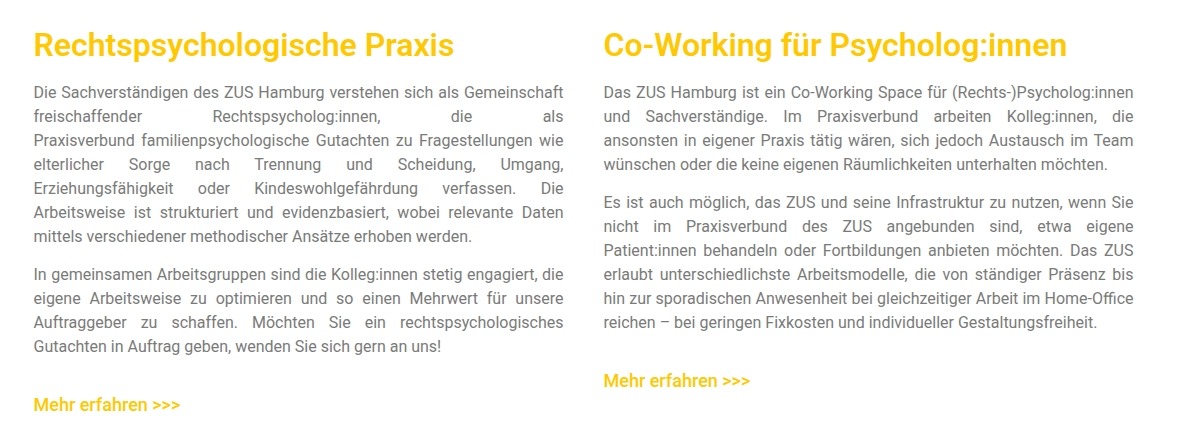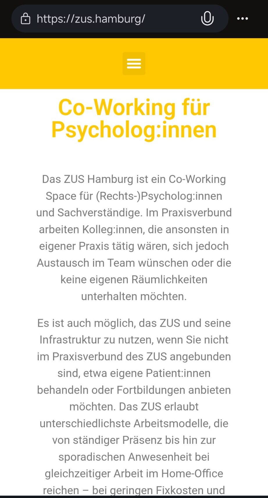 Der Beleg: Wörtliches Zitat der Webseite: „Das ZUS Hamburg ist ein Co-Working Space für (Rechts-)Psycholog:innen […] Kolleg:innen, die ansonsten in eigener Praxis tätig wären […]“.